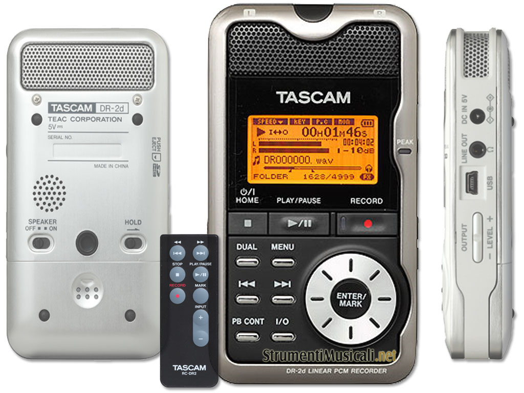il DR-2D registra in digitale in formato Wav o MP3, sempre in elevatissima qualità e su supporto SD (una da 2GB è in dotazione) e/o SDHC. Due microfoni a condensatore integrati assicurano la necessaria ripresa sonora di qualità fino a 96 kHz/24-bit, ma sono disponibili anche un ingresso microfonico (alimentazione plug-in) e un ingresso di linea per altre sorgenti audio. Il DR-2D prevede molte caratteristiche importanti già viste sopra, nel DR-08, con un occhio rivolto al professionista. Infatti la sua caratteristica più rilevante è la possibilità di creare due registrazioni contemporanee con livelli di gain differenti, oppure registrare in simultanea dall' ingresso mic e linea.