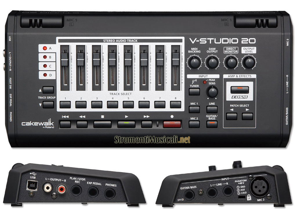 Quando siete pronti per registrare, VS-20 vi metterà nella situazione più semplice per iniziare. Caratteristiche: VS-20 è sia un'interfaccia audio stereo che una superficie di controllo con microfoni stereo integrati Grandi suoni di chitarra utilizzando l'ingresso Hi-Z e gli effetti DSP BOSS COSM integrati per la simulazione di amplificatori e di 4 modelli di pedale (Compression, Overdrive/Distortion, Chorus/Mod, Delay) inclusi 36 effetti Boss e 50 preset. Registrate la voce con l'ingresso XLR dotato di Phantom Power e utilizzate gli effetti COSM DSP intergarti a latenza zero come ad esempio harmony, correzione del pitch, riverbero e altro ancora. L'Hardware e il software hanno un'interfaccia simile per rendere intuitiva e immediata la registrazione Il design compatto e l'alimentazione via USB rendono il V-Studio 20 perfetto per la registrazione mobile con laptop o notebook