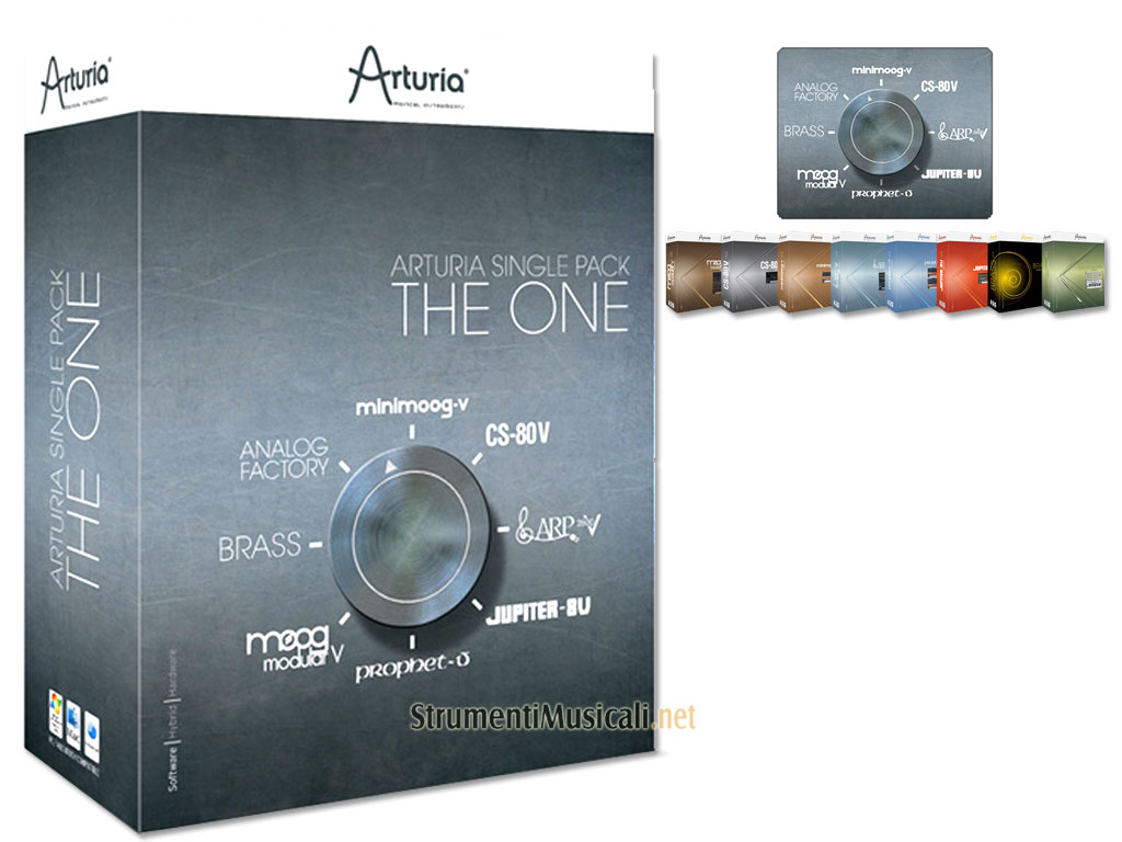 THE ONE, un'unica confezione che contiene tutti gli strumenti Arturia e una licenza per attivarne uno a scelta: potete installare e provare tutti gli strumenti senza alcuna limitazione per 15 giorni per scegliere alla fine del periodo quale volete autorizzare e continuare ad usare al termine della demo: Moog Modular V, CS-80V, ARP2600 V, Minimoog-V, Prophet V, Jupiter-8V, Brass 2.0 e Analog Factory. Il costo del pacchetto equivale a quello di una licenza Arturia.