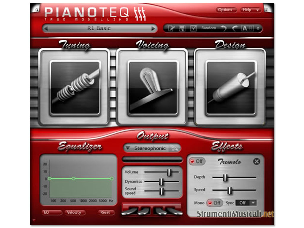 • Note per note adjustment for 22 physical parameters: detune, unison width, direct sound duration, hammer hardness piano, hammer hardness mezzo, hammer hardness forte, spectrum profile, hammer noise, strike point, pickup symmetry, pickup distance, impedance, cutoff, Q factor, string length, note resonance, quadratic effect, damper position, damper duration, damper noise, key release noise, volume.