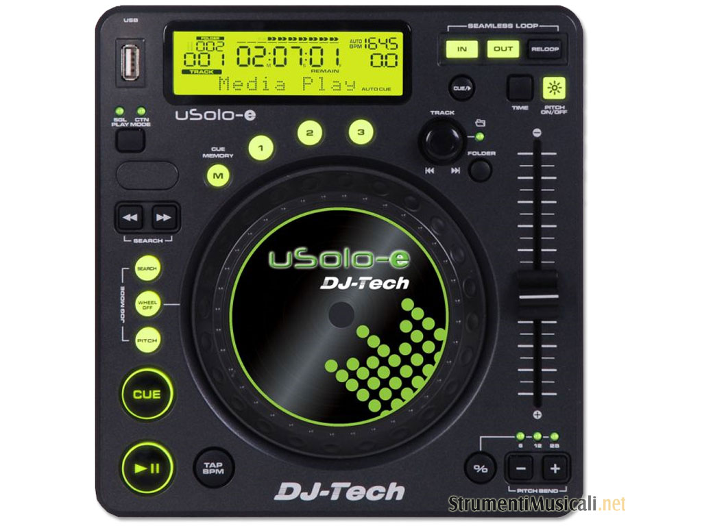 Mai più cd da portare! uSolo-e è un Media Player Usb con una Jog Wheel XXL. Con un accesso ai brani immediato potrete riprodurre e manipolare tutti i vostri mp3 da qualsiasi fonte USB come pen drive, iPod ed Hard Disc (fino a 250 GB). La navigazione all'interno delle cartelle avviene facilmente dalla Knob multifunzionale. uSolo-e ha il fader start che permette di riprodurre i brani solamente muovendo il crossfader o i fader sui mixer compatibili e altre funzioni utilissime come il buffer di memoria Anti-Shock, la ricerca accurata dei frame, contatore automatico di BPM, lo start istantaneo, il seamless looping e 3 punti di CUE