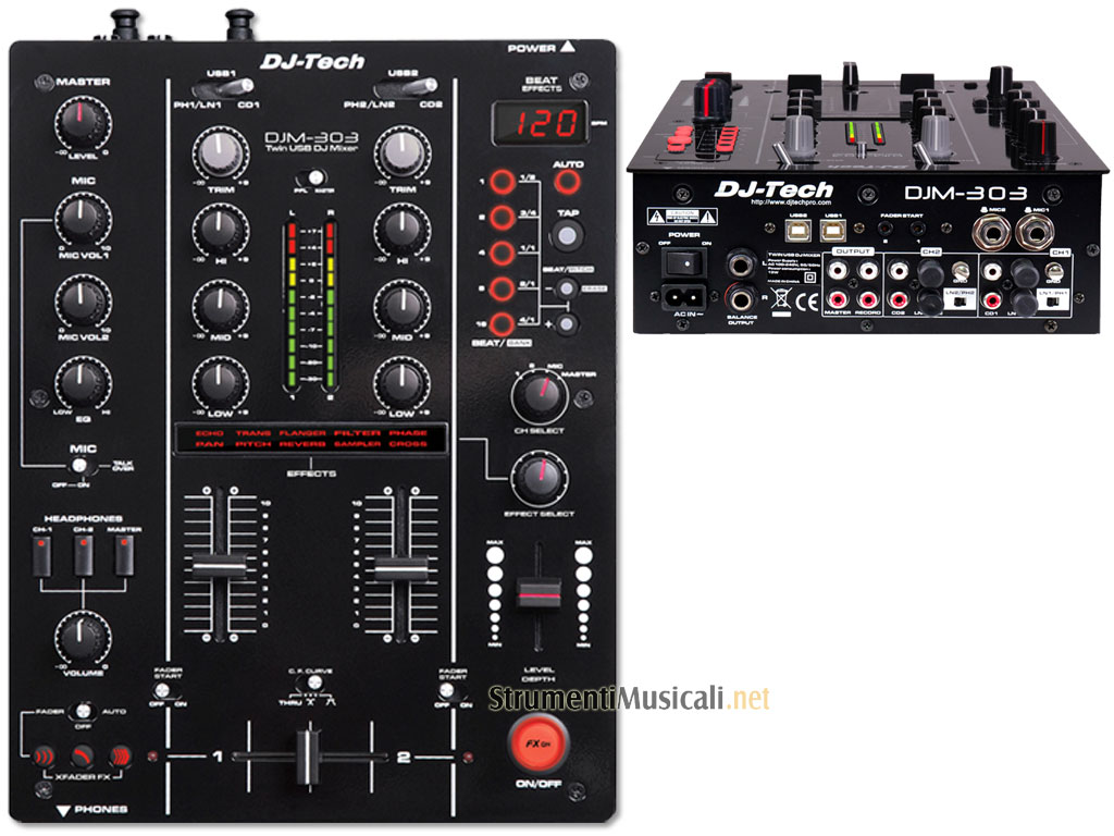 DJ-Tech DJM-303 è il nuovissimo mixer con una doppia scheda audio USB (per registrare e riprodurre direttamente dal vostro computer), 9 effetti sincronizzabili al BPM, incluso il nuovissimo In-Loop Sampler, e 3 effetti sul Crossfader. DJM-303 monta dei fader ALPHA che garantiscono un lungo cilco di vita con 2 curve di taglio selezionabili per il Crossfader. Riprodurre 2 sorgenti dal computer è adeso possibile grazie alle 2 porte USB.