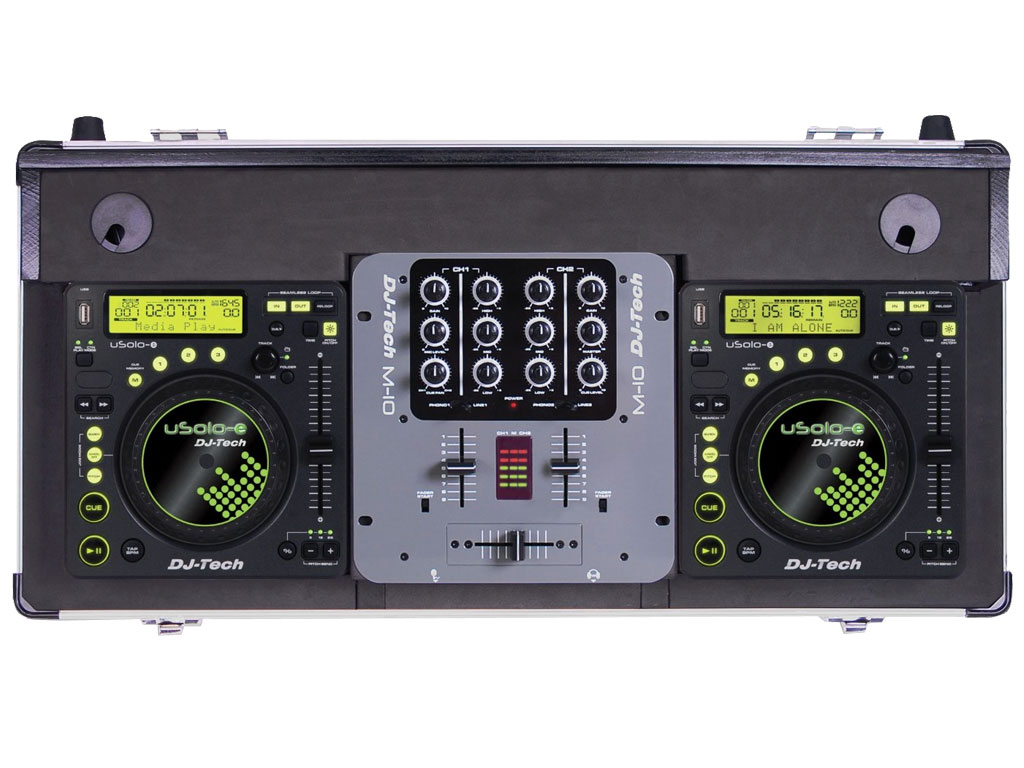 USB DJ in a Box è la combinazione di due uSolo-e, un mixer M-10 più un filght case. uSolo-e è un Media Player USB con una Jog Wheel XXL. Con un acccesso ai brani immediato potrete riprodurre e manipolare tutti i vostri mp3 da qualsiasi fonte Usb come pen drive, iPod ed hard disc (fino a 250 GB). La navigazione all'interno delle cartelle avviene facilmente dalla Knob multifunzionale. M-10 è un mixer a due canali con tutte le caratteristiche essenziali di un mixer professionale come 4 ingressi, equalizzazione a 3 bande su ogni canale, uscita master ed uscita cuffia per il preascolto, ingresso microfonico, Level meter sul canale e sul master e la funzione Fader Start.