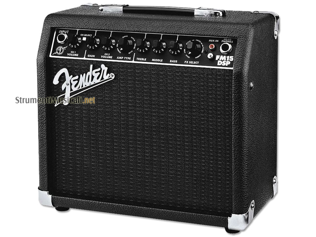 Il nuovo e versatile Fender FM 15 DSP mette a disposizione dei chitarristi una gran quantità di timbri ed effetti in due canali selezionabili. L'amplificatore sviluppa 15 watts attraverso un cono da 8"; l' FM 15 DSP è dotato del famoso suono pulito Fender sul primo canale, mentre il secondo canale vi consente di scegliere fra 16 grandi timbri di amplificatori. E' dotato di 15 effetti tra cui: reverb, delay, tremolo, chorus, flange e combinazioni varie, di un simulatore di chitarra acustica dal suono spettacolare. Tra le altre eccezionali caratteristiche ricordiamo l'ingresso ausiliario per collegare lettori CD, MP3 o altre sorgenti e l'ingresso cuffie per esercitarsi in silenzio