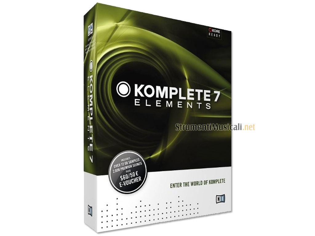 Con più di 12 GB e 2.000 suoni premium dalla raccolta di suoni ed effettti KOMPLETE, questo è un "ready-to-roll" bundle software professionale per tutti gli stili di produzione. Komplete 7 Elements combina le capacità di sintesi, sampling e processamento effetti dei player Kontakt 4, Kore 2, Guitar Rig 4 e Reaktor 5, per un assortimento di suoni acustici, inclusi sample orchestrali VSL, batterie Abbey Road, e una larga scelta di strumenti da band, musica classica ed etnica; il tutto completato da una sezione di synth analogici classici e altre tastiere vintage.
