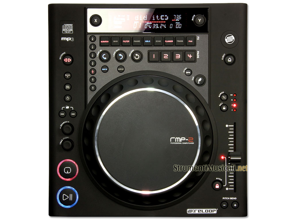 Reloop RMP-2 MKII è un CD player professionale MP3 compatibile, con audio di altissima qualità con caricamento dotato di frontale di tipo slot-in, jog wheel di grandi dimensioni con “vinyl feeling” e doppio sensore, scratch simulator di altissima qualita`, effetti DSP sincronizzabili al BPM, BPM counter automatico e manuale, 4 sample bank con 5 secondi di campionamento ciascuno, 4 cue-point, supporto ID3-TAG e CD text, ricerca track and folder, display FVD di grandi dimensioni, pitch +/- 4/6/8/16/100% con pitch lock e master speed, pitch bend fino a +/- 100%, funzioni auto cue, loop/reloop senza fine, frame search, instant start, relay e fader start play, memoria anti shock da 10 secondi, uscite audio di linea e digitale, uscita per cuffie con volume regolabile e piedini anti vibrazioni.