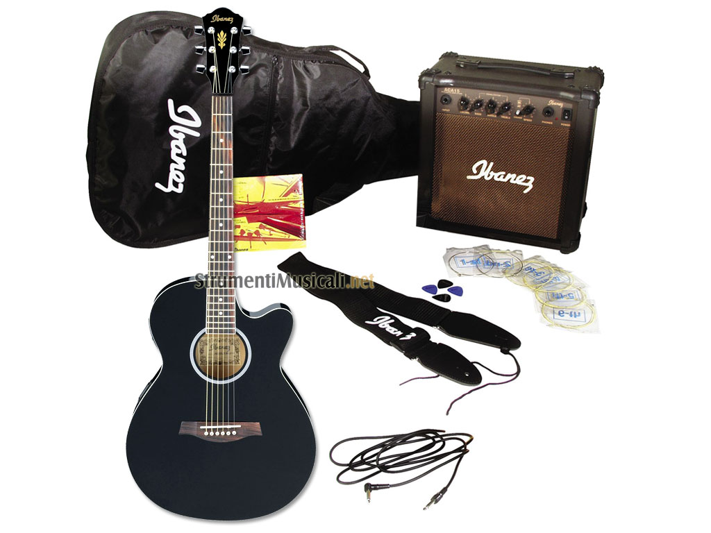 Il kit comprende una chitarra elettroacustica, un amplificatore da 15W c/chorus, una borsa morbida imbottita, cavo, tracolla, plettri e custodia accessori.