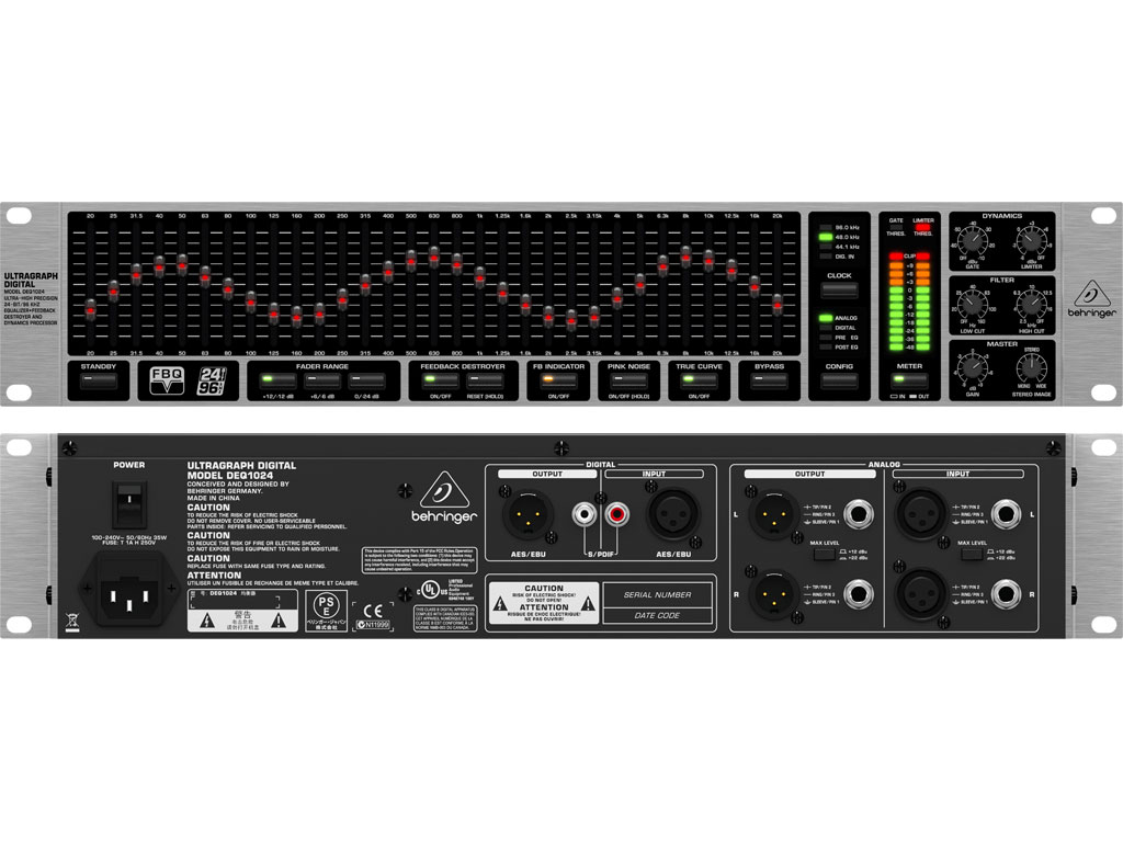L'Ultragraph Digital DEQ1024 è un equalizzatore stereo digitale a 31 bande ad altissima risoluzione e Feedback Destroyer. Combina prestazioni digitali senza pari con un semplice e intuitivo funzionamento di tipo analogico. Il rivoluzionario sistema di rilevamento del feedback FBQ rivela istantaneamente le frequenze critiche e può essere utilizzato come analizzatore audio, rendendo il DEQ1024 un must-have per ogni rack professionale. Attivando il Feedback Destroyer automatico si rimuove il feedback in una frazione di secondo. Un DSP "state-of-the-art" a 24/48-bit e convertitori 24-bit/96 kHz A/D e D/A forniscono il massimo in termini di risoluzione sonora. La sezione EQ dispone di tre campi di funzionamento selezionabili (± 12 dB, ± 6 dB e 0/-24 dB) e 31 fader da 45mm illuminati di alta qualità. La funzione selezionabile TRUE CURVE traduce con precisione le posizioni dei fader in una esatta "What-You-See-Is-What-You-Get" risposta in frequenza. Inoltre, il DEQ1024 è dotato di filtri taglia basse e taglia alte, un Noise Gate/Peak Limiter ed un generatore di rumore rosa, più un imager stereo che fornisce una incredibile valorizzazione spaziale ed una migliore immagine stereo. Una interfaccia digitale AES/EBU e S/PDIF offre ampia flessibilità di connessioni e consente di selezionare tre frequenze di campionamento (44.1, 48 e 96 kHz). Il DEQ1024 dispone di ingressi ed uscite servobilanciate con connettori XLR e 1/4" TRS placcati in oro.
