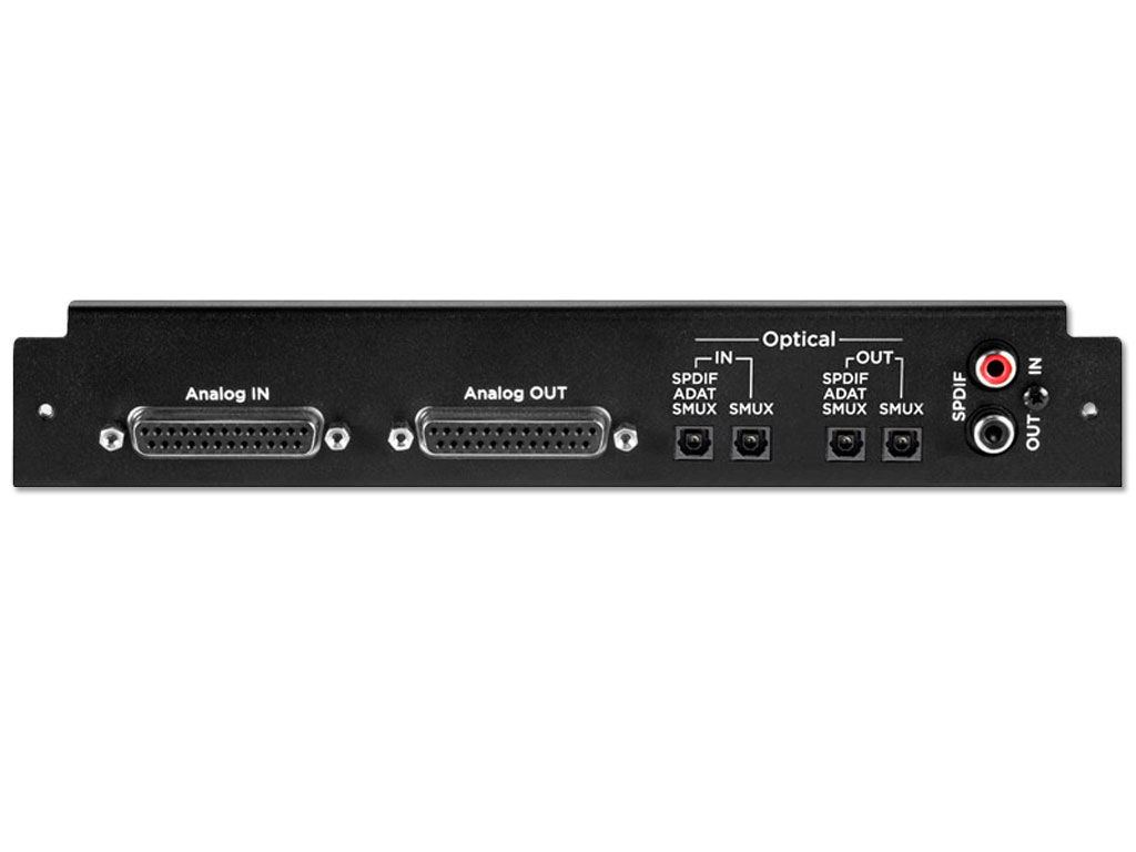 Modulo I/O dotato di 8 In e 8 Out analogici bianciati con connettori D-SUB 25, 2 In e 2 Out ottici (8 canali ADAT a 44.1-48 Khz, 8 canali SMUX a 88.2-96 KHz, 2 canali SPDIF a 192 KHz), In e Out coassiali (2 canali SPDIF a 192 KHz).
