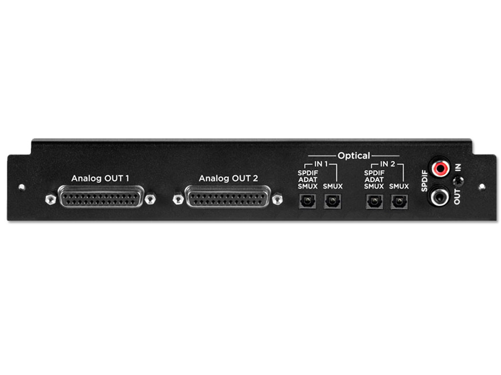 Modulo I/O, dotato di 16 Out analogici bianciati con 2 connettori D-SUB 25, 4 In ottici (16 canali ADAT a 44.1-48 Khz, 16 canali SMUX a 88.2-96 KHz, 2 canli SPDIF a 192 KHz), In e Out coassiali (2 canali SPDIF a 192 KHz).